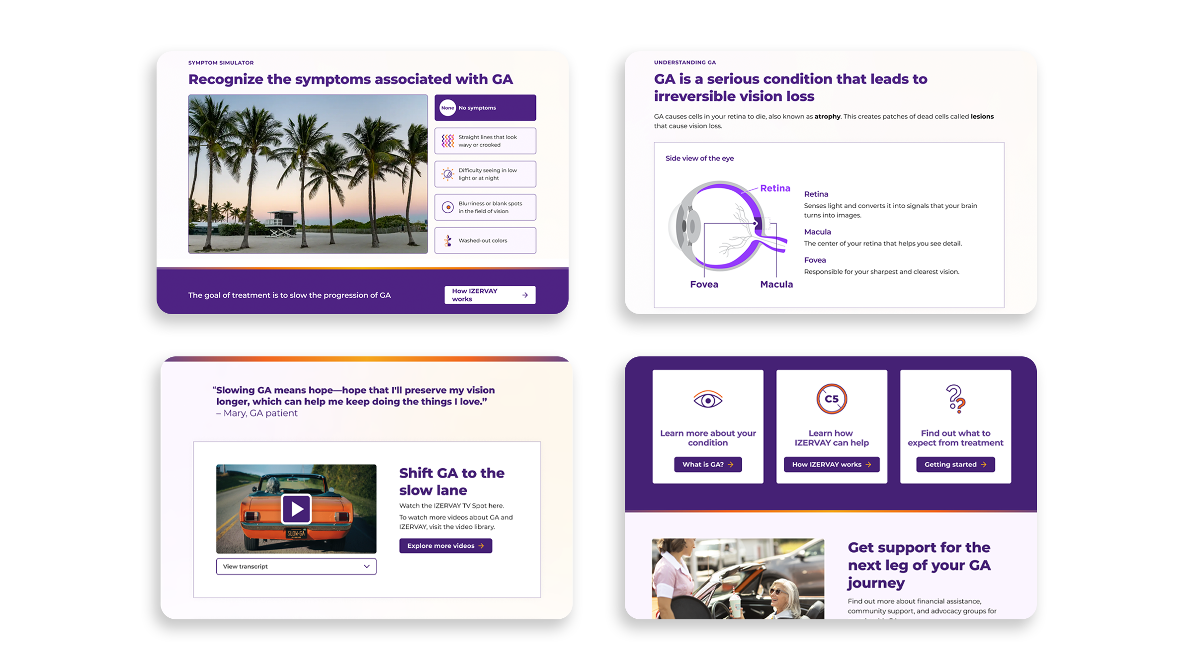 GA patients are typically over 65 and may already be experiencing symptoms of vision loss. With that in mind, user experience and accessibility became key factors in content development and website design. Accessibility and website metrics were analyzed and helped to shine a light on ways to improve our site for our visually impaired audience and drive continued refinements.